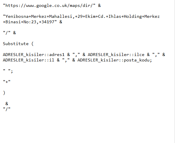 Belirli bir güzergah adresinden Belirli bir merkeze google haritalarda güzergah çıkarmak istiyorum bunu aşağıda ki resimdede görüldüğü gibi Single step le Open URL de Google Maps da yapabiliyorum ancak bunu nasıl dinamikleştiririm.Gelinecek güzergahda bi sıkıntı yok ama Toplanılacak Merkezi nasıl bir Field tanımlayıp Script yapabiliriz.Yani kısaca bütün herşey Field lere elle girilip bir düğme ile çalıştırılacak.