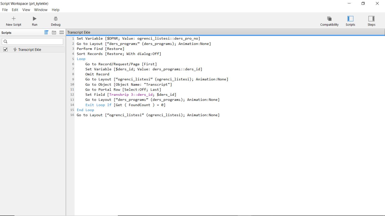 Merhabalar, ekteki dosyada bir öğrenci listesi var ve her öğrenci bir ders programına kayıtlı. Ders programı içerisinde birden fazla ders olabiliyor. Öğrencilerin ilgili derslerinin transkrip olarak başka bir tabloya portaldan eklenmesi nasıl yapılabilir veya başka bir yolu daha var mıdır? (Not: file maker 7 dosyasında)