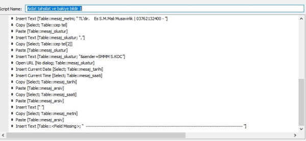 Script değişik fieldlara giderek kopyalama yapıp aralara muhtelif metinler ekleyerek html sms satırı oluşturmakta. Fakat scripti çalıştırdığımda bazı alanları ya kopyalamıyor yada eksik (500 ise 50 aktarıyor.) alıyor.