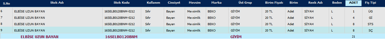 Tek stok hareket tablomda (hareket kodlarım) var.(Adet fieldi tek)