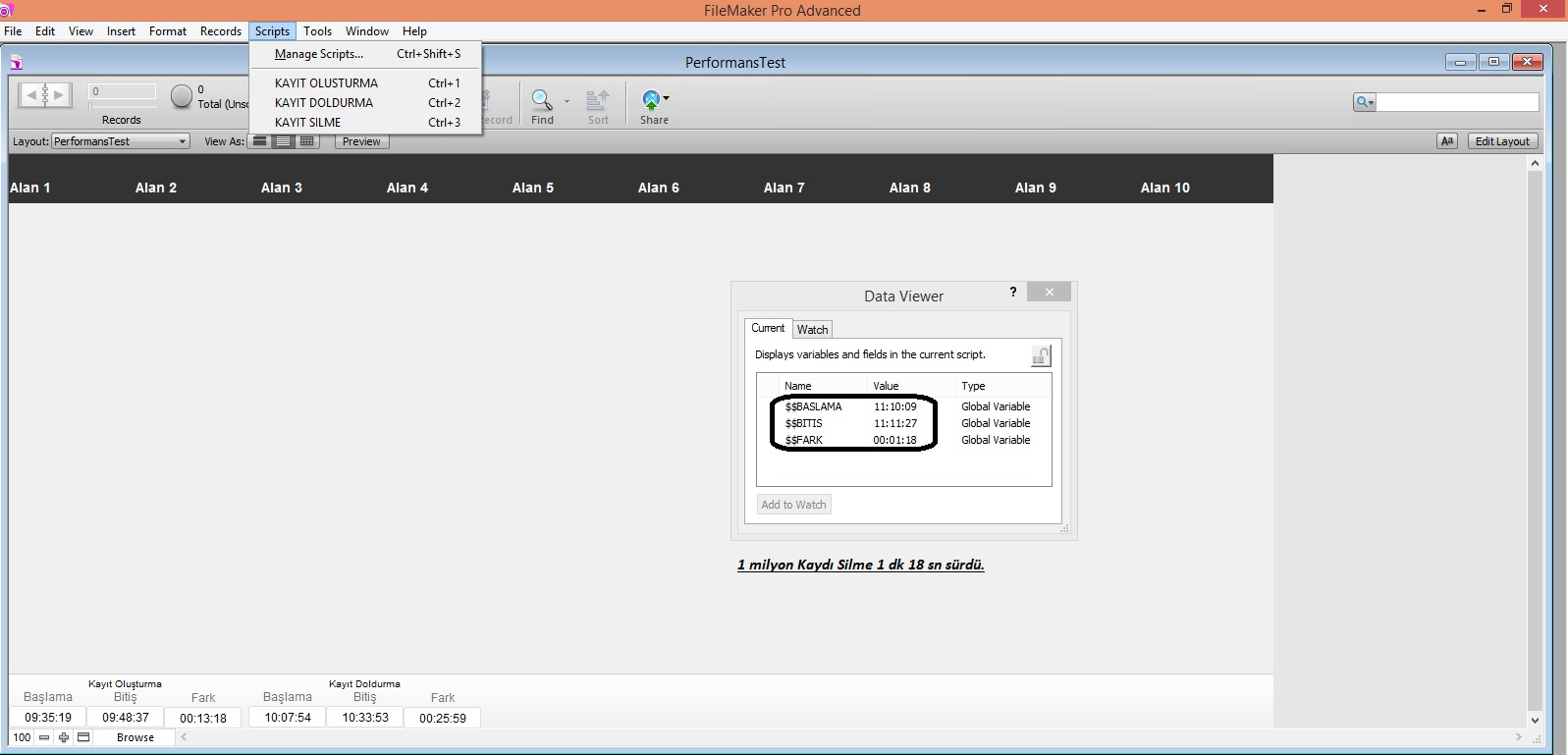 Evet arkadaşlar, ben Filemaker Testimi yaptım ve değerler aşağıdadır. Sıfır database sıfır tablo sıfır calculation ve sıfır summury :)