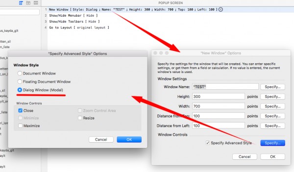 New Window stili olarak Dialog Window (Modal) secin ve pencerenin buyuklugunu ayarlayin. Pencere stili icerisinde maximize ve resize seceneklerini pasiflestirinki pencerenizin boyutu degistiriltelemesin.